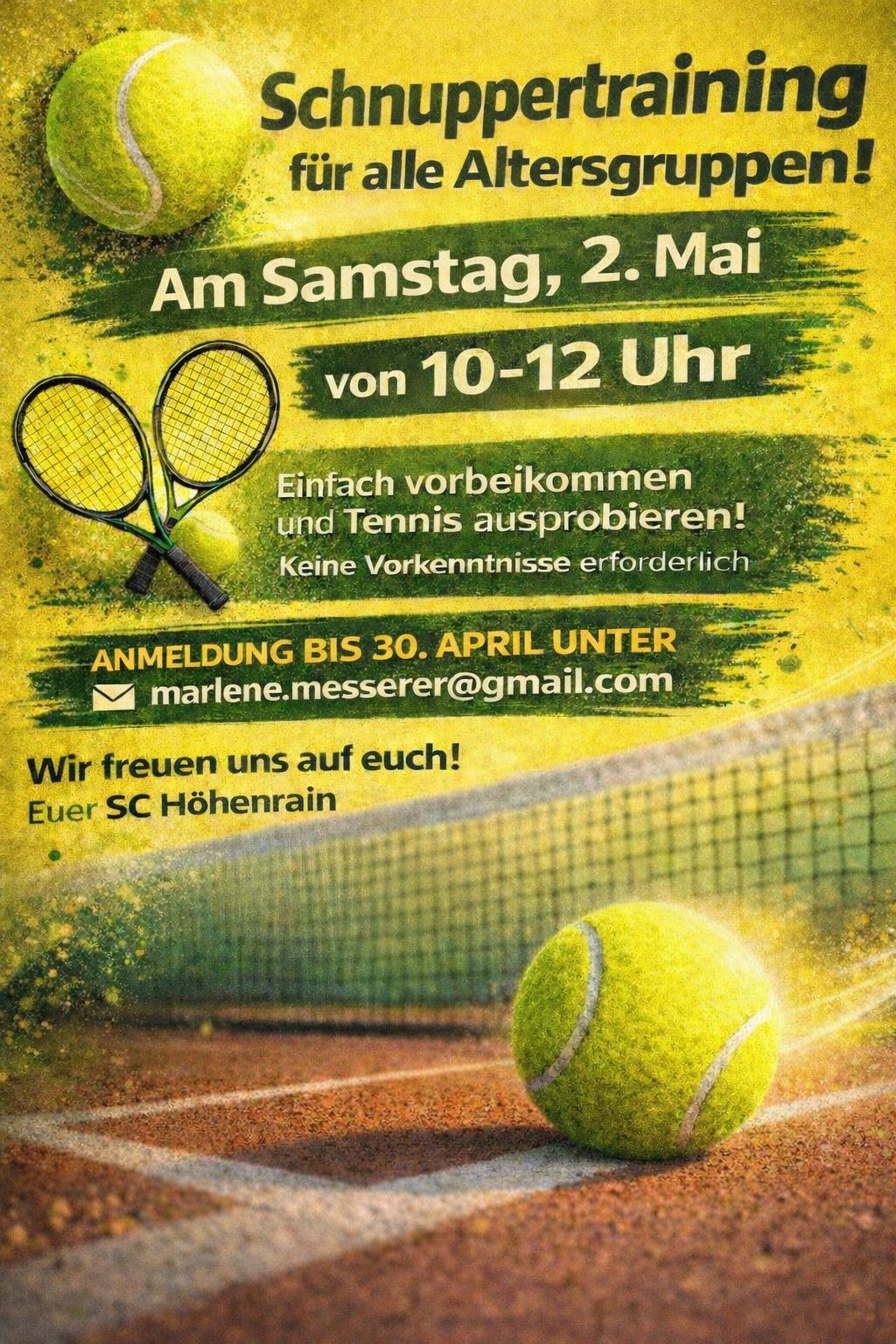 Schnuppertraining Tennis Posted on 15. April 2026 by Admin Posted in Allgemein, Tennis für alle Altersgruppen am Samstag, den 02. Mai 2026 von 10 – 12 Uhr.